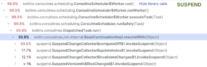 But with suspend, each suspension point splits the function into a separate continuation. If computeDiff() and updateIndex() are suspend functions, the profiler sees them as independent work items scheduled on the dispatcher: