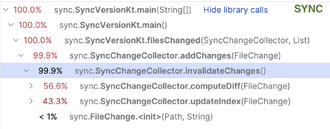 The expensive invalidateChanges() shows up as a hot subtree. You see immediately where the time goes.
